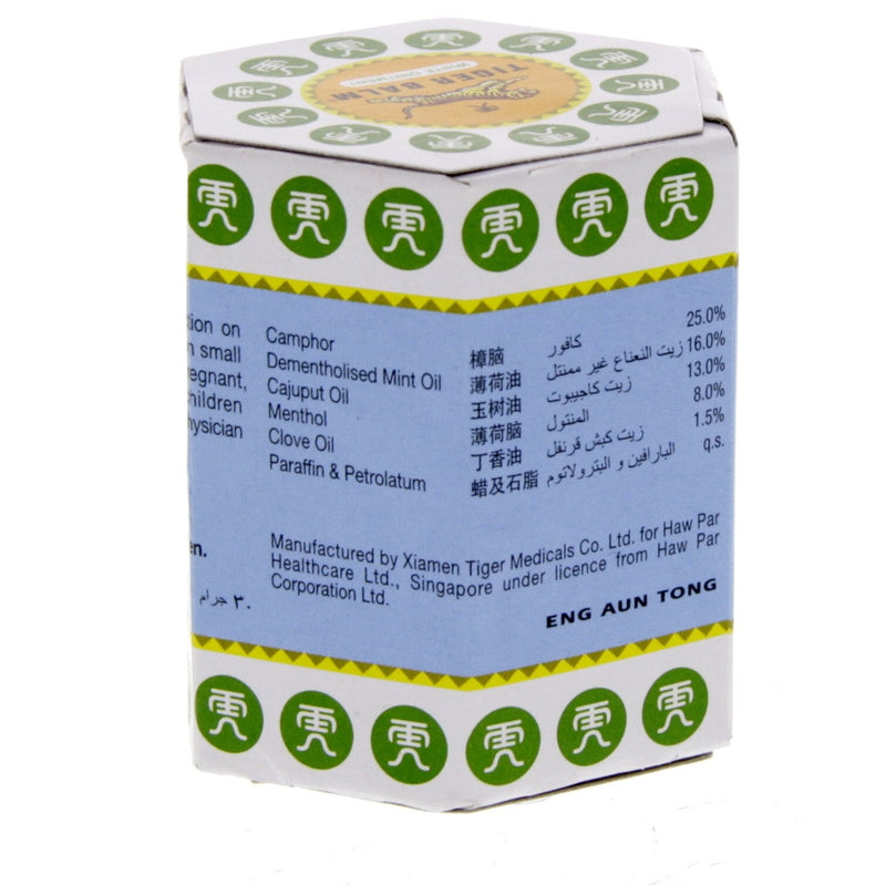 **Tiger Balm White Ointment 30g** provides quick relief for **muscle pain**, **headaches**, and **nasal congestion**. Infused with **menthol** and **camphor**, this ointment is a trusted solution for fast-acting relief. Whether you're experiencing **muscle soreness**, **headaches**, or a **blocked nose**, Tiger Balm White Ointment will provide the soothing comfort you need.